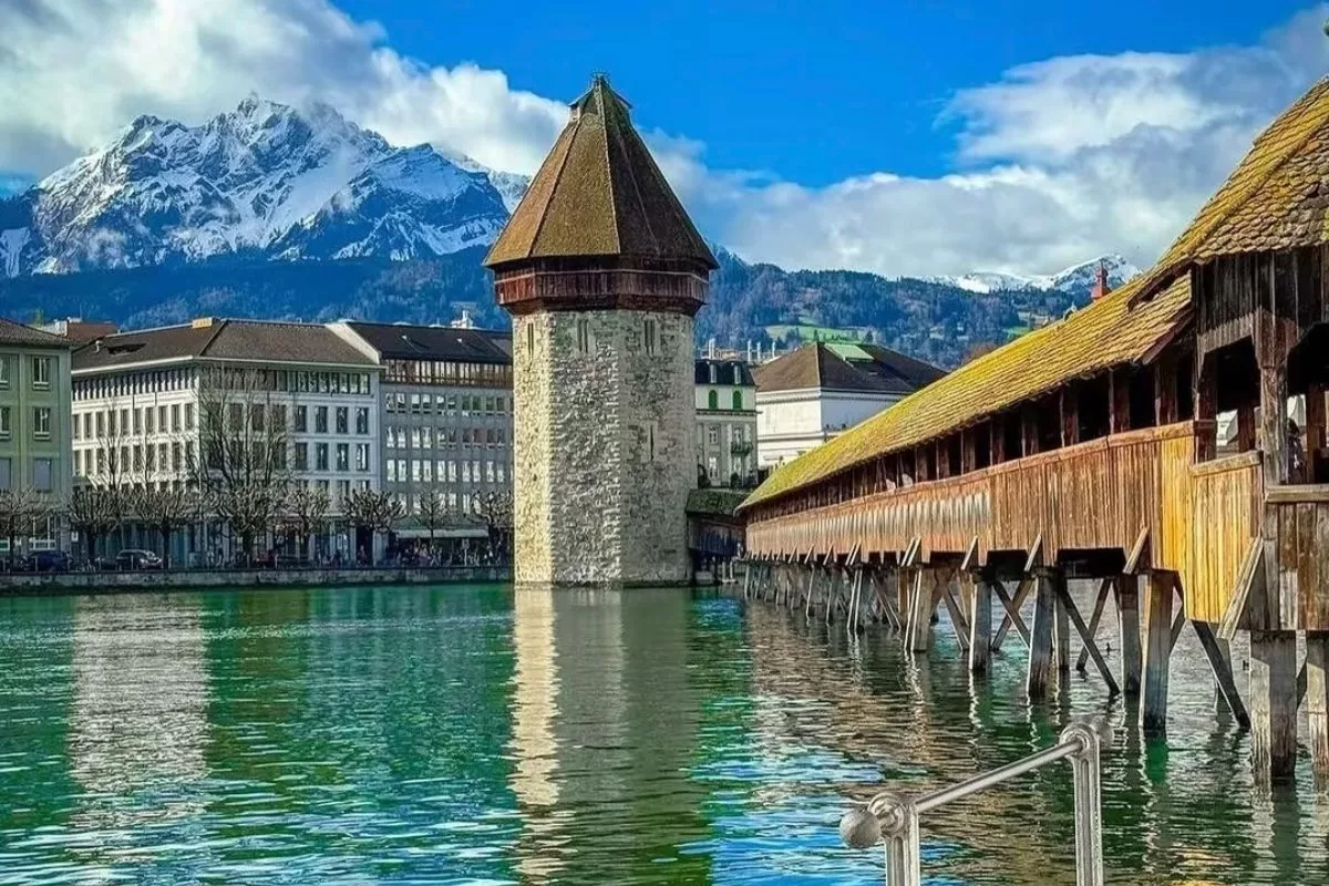 • 🌉 Cầu Chapel – Biểu tượng cổ kính của Lucerne; cây cầu gỗ có mái che lâu đời nhất châu Âu (thế kỷ XIV), nối liền Phố Cổ và Khu Phố Mới.